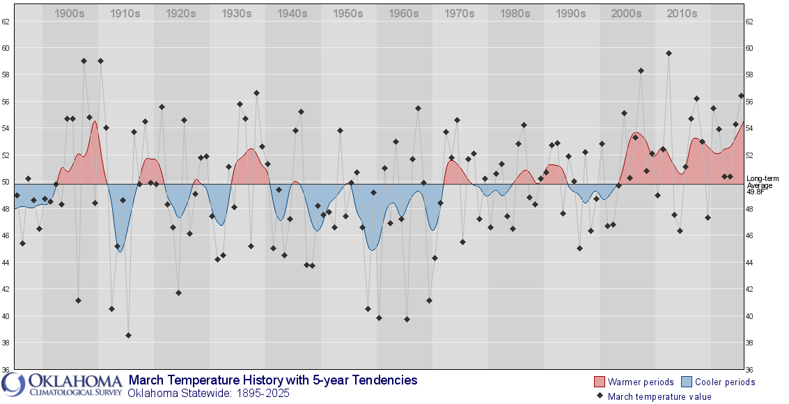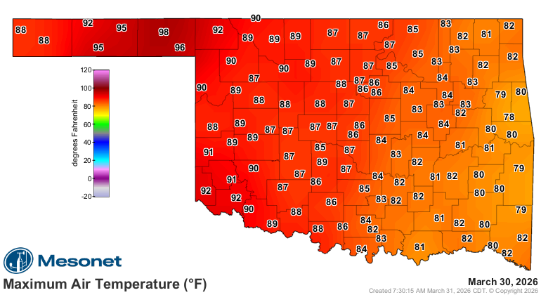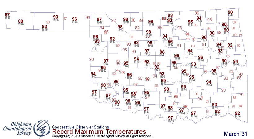 March 30 in Oklahoma (old record: Tipton, 97, 1940).