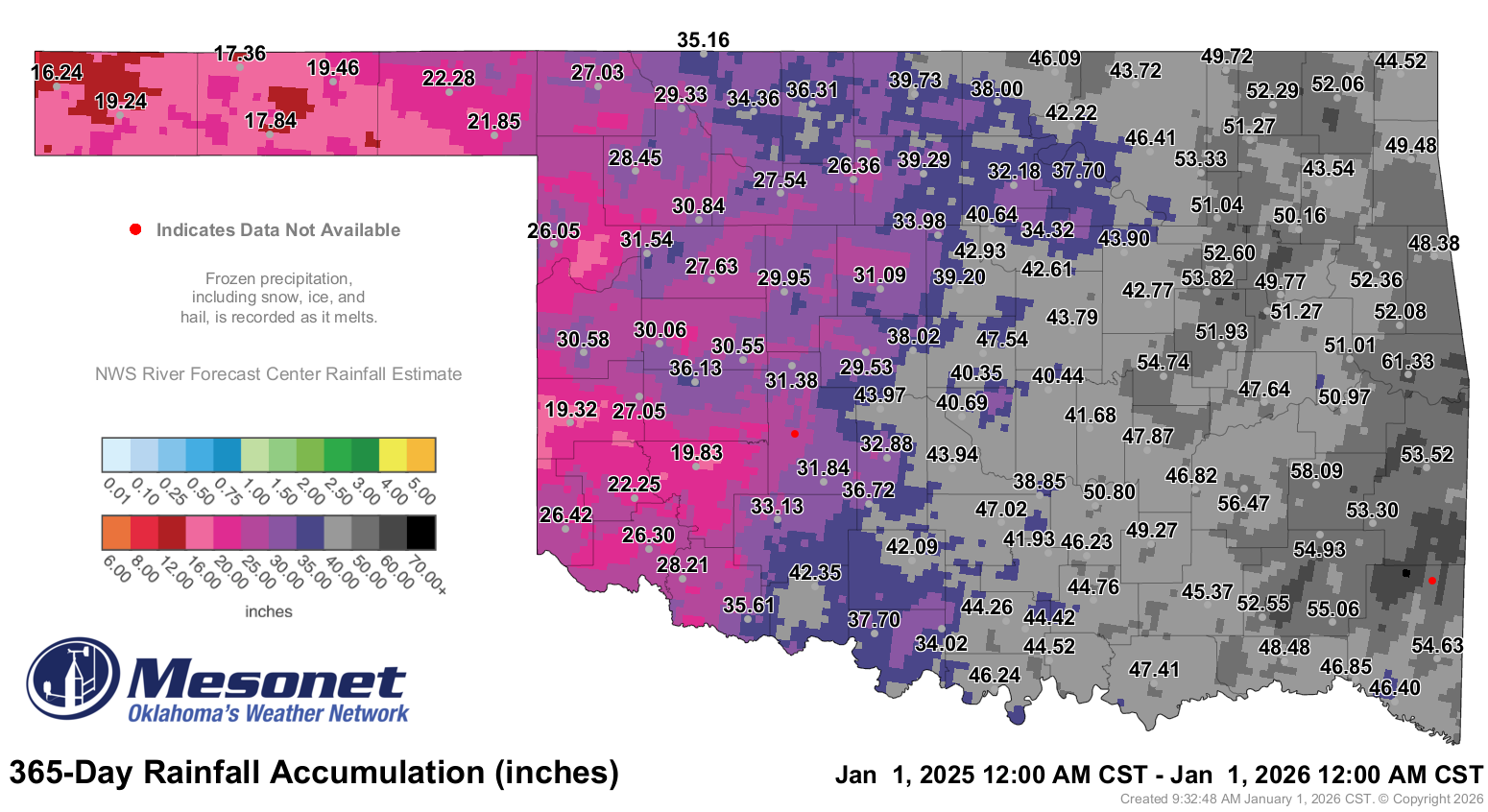• Rainfall extremes: High of 61.33 inches at Sallisaw; low of 16.24 inches at
