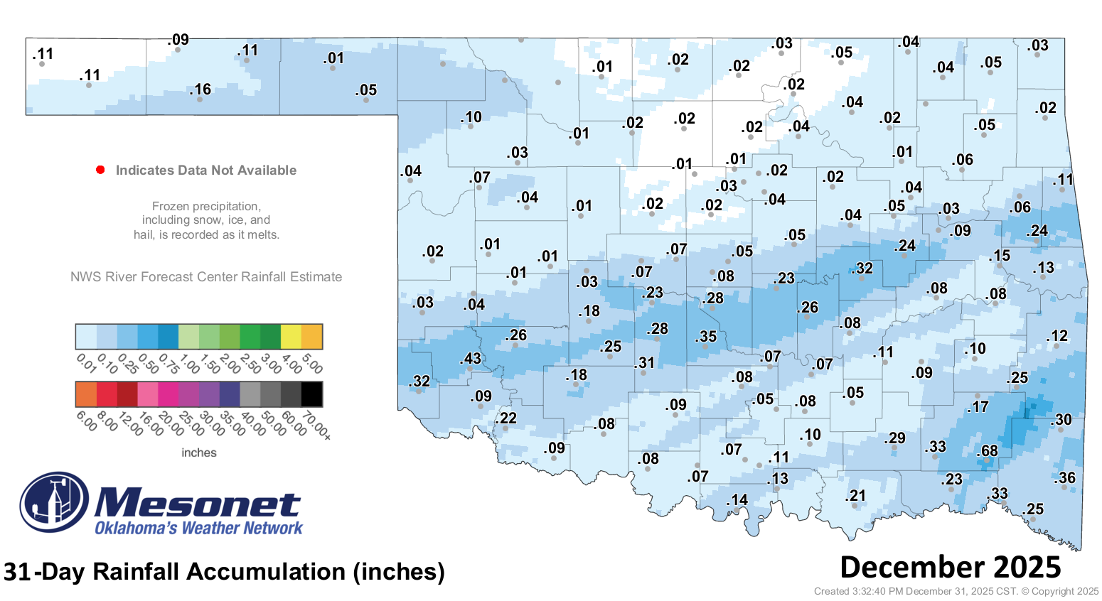 led the state with just 0.68 inches. Seventy-seven Mesonet sites recorded a