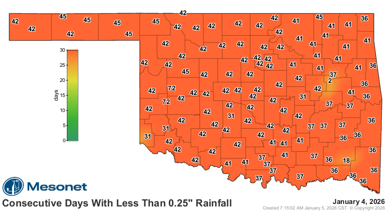 • Rainfall totals under 0.25 inches: 105 instances recorded at the 120 Oklahoma