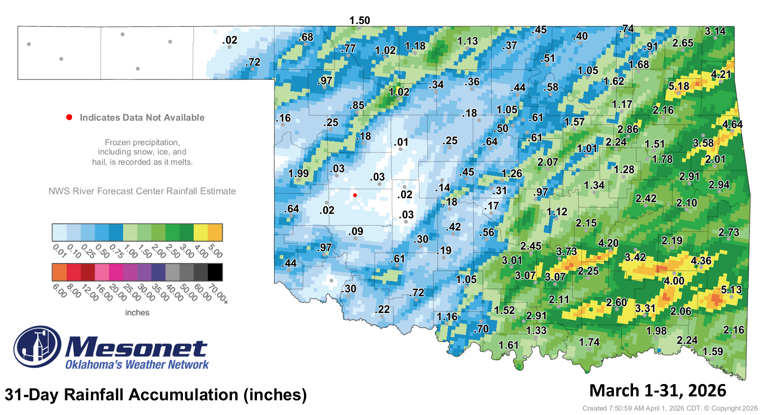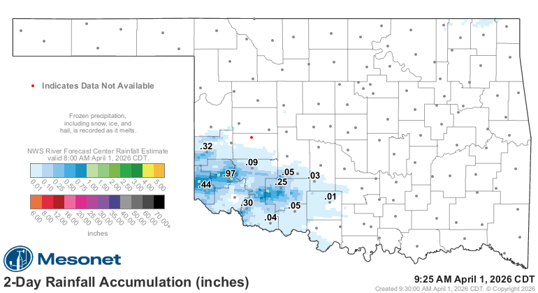 • Rainfall extremes: High of 5.18 inches at Pryor; no precipitation recorded at