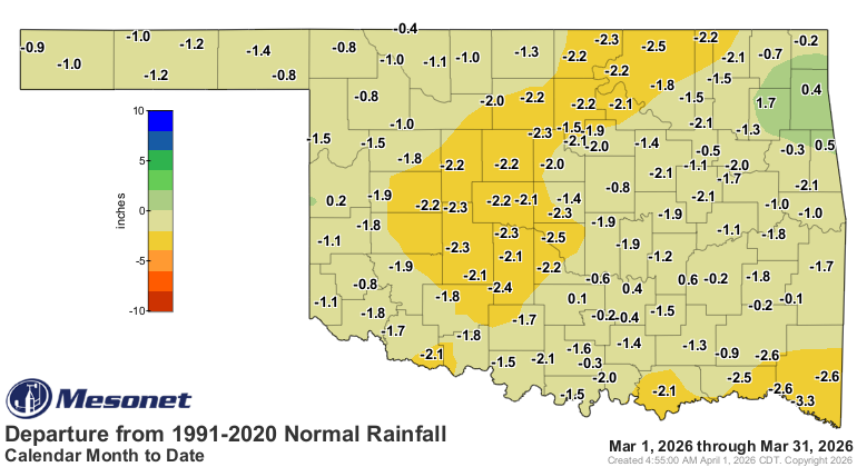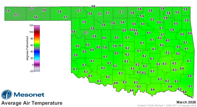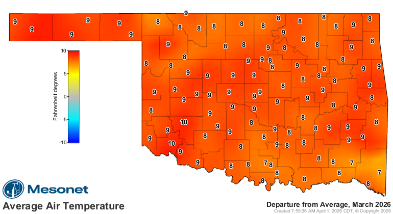 Oklahoma’s statewide average temperature finished at 60.3 degrees in March, 9.1