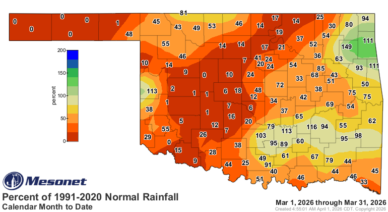 least 100 degrees. The heat peaked on March 26 when the Oklahoma Mesonet site